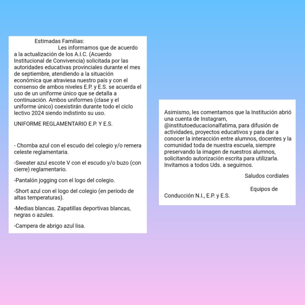 Publicado en Oct 3, 2023 en NovedadesFamilias, dejamos la siguiente información sobre la actualización de Acuerdos Institucional de Convivencia, detallando como será el uniforme a partir del 2024 y la dirección de Instagram @institutoeducfatima, donde enviaremos información y compartiremos nuestro trabajo como comunidad.